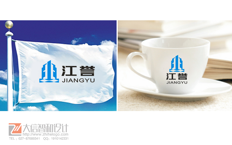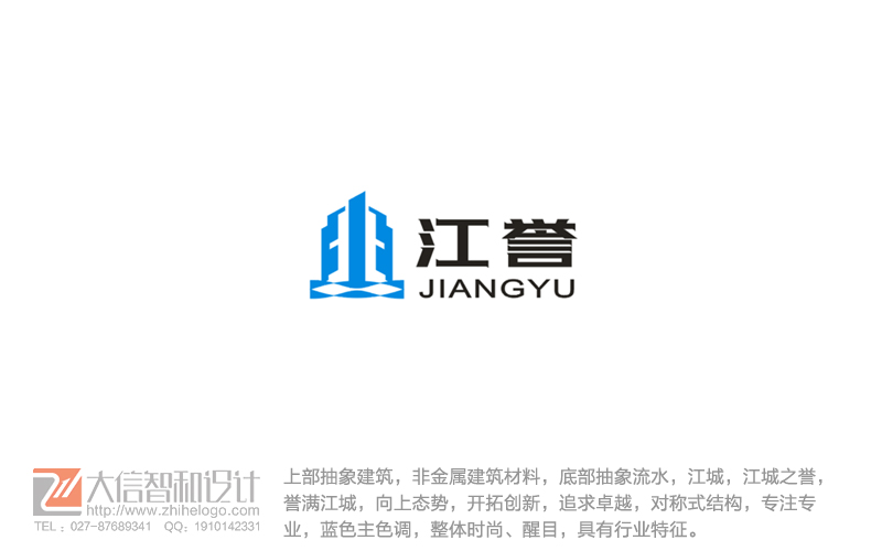 江誉:上部抽象建筑,非金属材料,底部抽象流水,江城之誉,誉满江城,向上态势,开拓创新。对称式结构,专注专业。蓝色主色调,整体时尚,醒目,具有行业特征。