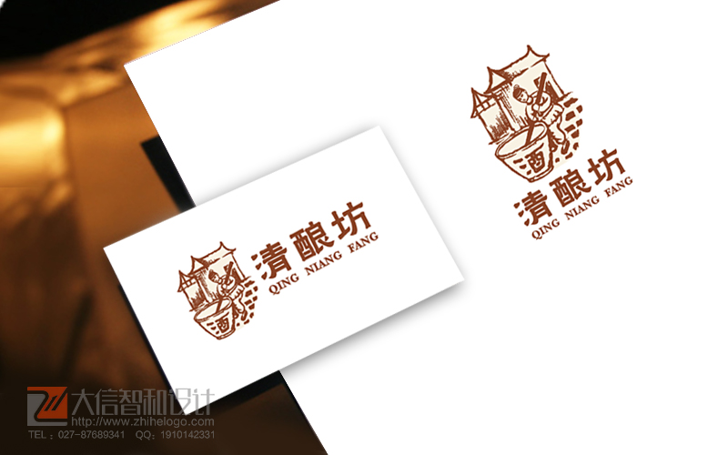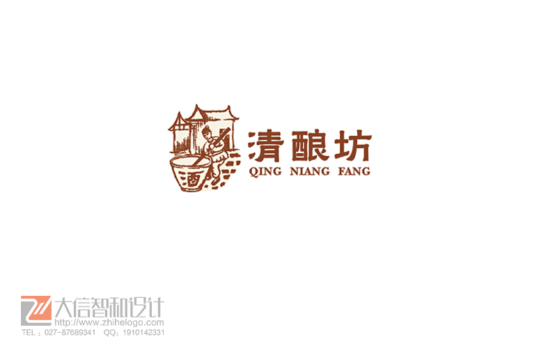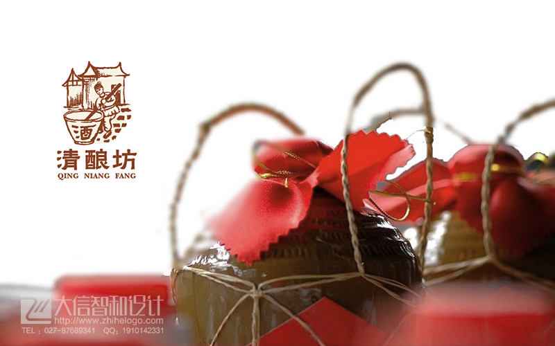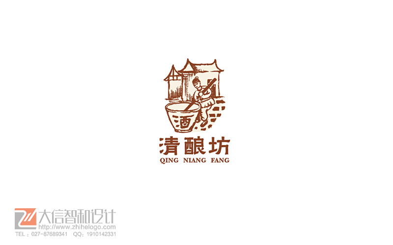 清酿坊:传统清明白酒商标设计。以古人酿酒的画面为设计主体,表现清明酒的传统久远,画面采用白描的方式,古朴美,颜色沉稳内敛,整体设计富有文化内涵。