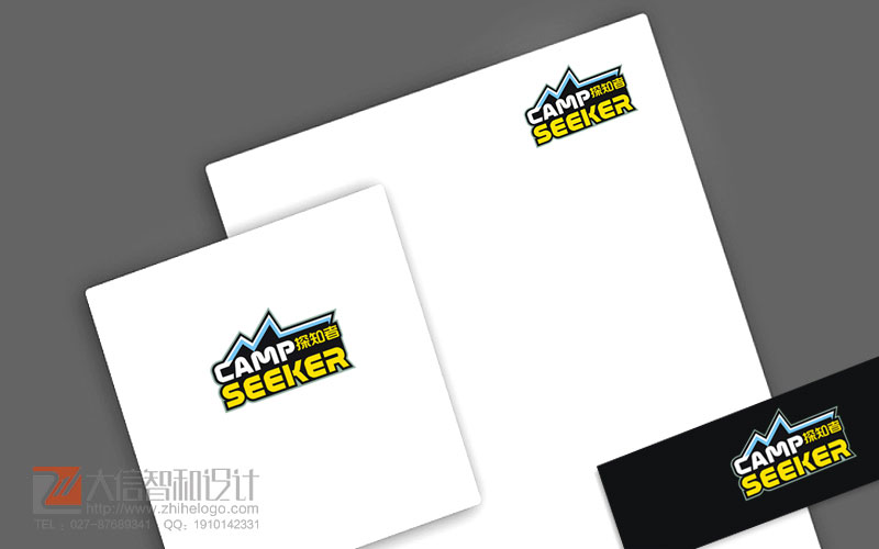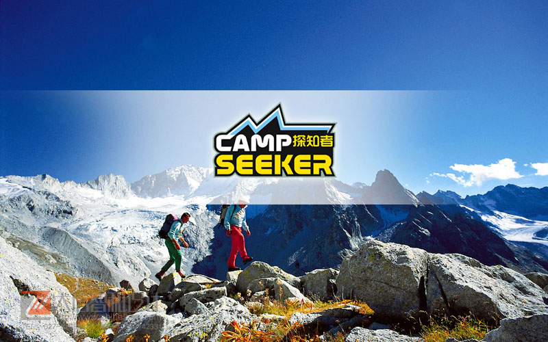 探知者:户外用品logo。字体设计为主,折线锐利,黄、蓝、白、黑色醒目美观,logo整体性强烈,富有锐气,符合户外用品特点。