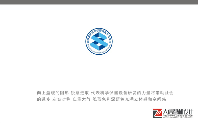 国家重大科学仪器设备开发专项:公共标识。向上盘旋的图形,寓意锐意进取,代表科学仪器设备研发的力量将带动社会的进步,左右对称,庄重大气,湖蓝和深蓝色对比充满立体感和空间感。时尚而不失庄严。符合公共标识特征。