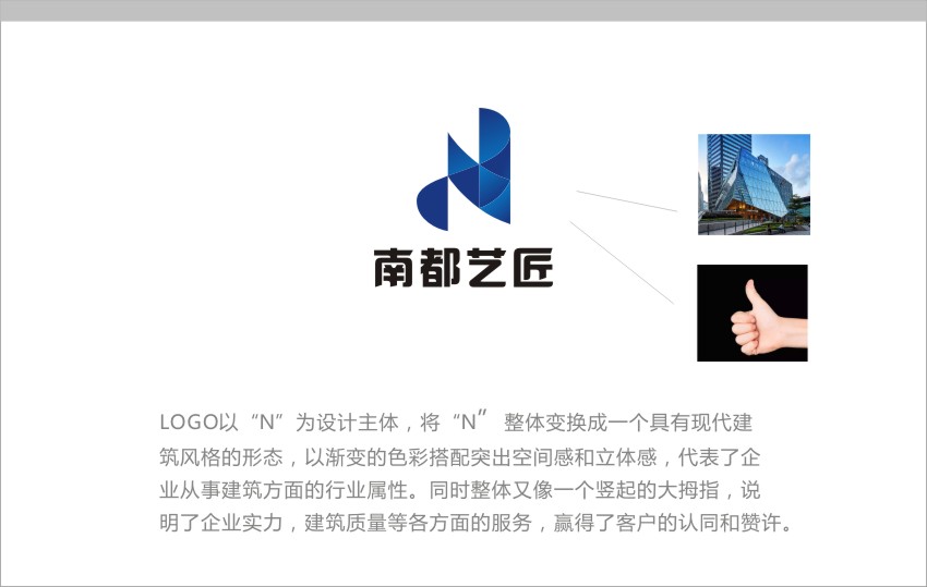 南都艺匠:LOGO以“N”为设计主体,将“N”整体变换成一个具有现代建筑风格的形态,以渐变的色彩搭配突出空间感和立体感,代表了企业从事建筑方面的行业属性。同时整体又像一个竖起的大拇指,说明了企业实力,建筑质量等各方面的服务,赢得了客户的认同和赞许。