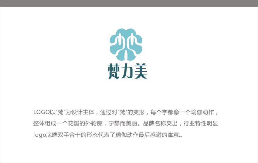 梵力美:LOGO以“梵”为设计主体,通过对“梵”的变形,每个字都像一个瑜伽动作,整体组成一个花瓣的外轮廓,宁静而美丽。品牌名称突出,行业特性明显,LOGO底端双手合十的形态代表了瑜伽动作感谢的寓意。