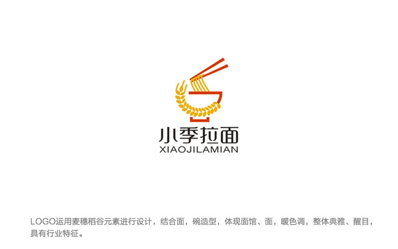小季拉面:LOGO运用麦穗稻谷元素进行设计,结合面,碗造型,体现面馆,面,暖色调,整体典雅,醒目,具有行业特征。