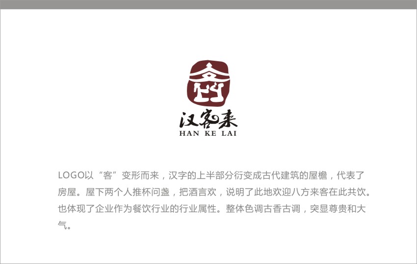 汉客来:LOGO以“客”变形而来,汉字的上半疗分衍变成古代建筑的屋檐,代表了房屋,屋下两个人推杯问盏,把酒言欢,说明了此地欢迎八方来客在此共饮,也体现了企业作为餐饮行业的行业属性,整体色调古香古色,突显尊贵和大气。