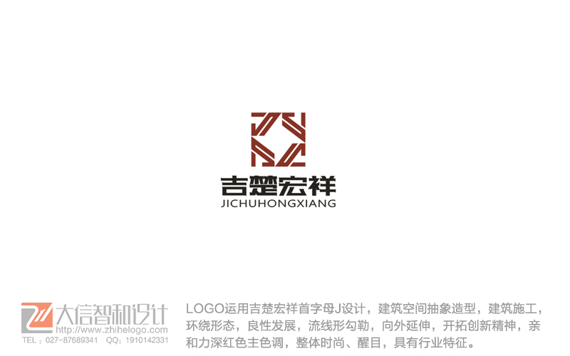 吉楚宏祥:LOGO运用吉楚宏祥首字母J设计,建筑空间抽象造型,建筑施工。环绕形态,良性发展,流线型勾勒,向外延伸,开拓创新精神,亲和力深红色主色调,整体时尚,醒目,具有行业特征。
